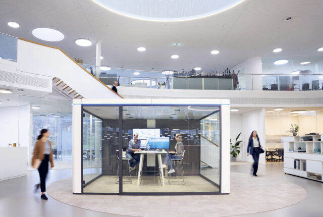 Agile Kommunikation: Bosse Mobile Möbel der Dauphin Group dienen dem offenen Teammeeting, ungestörte Gespräche können im akustisch abgeschirmten Bosse Cube geführt werden.