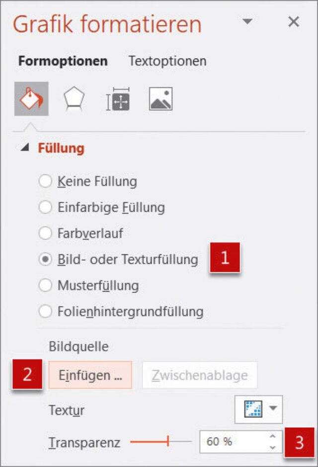 - Rechts im Aufgabenbereich Form formatieren unter Füllung die Option Bild- oder Textfüllung aktivieren [1]. Der Name des Aufgabenbereichs ändert sich nun in Grafik formatieren.