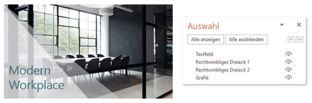 Tipp: Damit beim Anordnen von Bild, abdeckendem Rechteck und Text keine Pannen geschehen, kann man den Auswahlbereich am rechten Bildschirmrand mit Alt + F10 einblenden. Oder: Auf der Registerkarte Start ganz rechts die Befehlsfolge Markieren → Auswahlbereich wählen. Im Auswahlbereich lassen sich die einzelnen Objekte auf der Folie nicht nur leichter markieren, sondern auch deren Ebene ändern, indem man sie in der Liste per Ziehen mit der Maus nach oben oder unten verschiebt.
