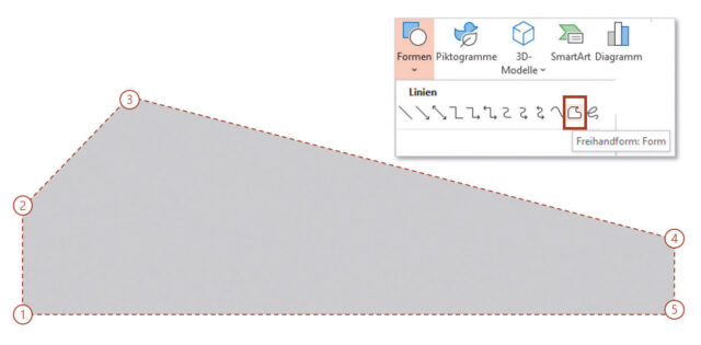 Nach dem letzten Eckpunkt [5] schließt man die Form, indem man auf den ersten Punkt zeigt und den Vorgang des Zeichnens per Doppelklick beendet.