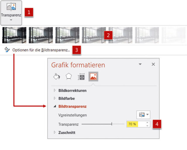 - Falls keine der Voreinstellungen für das Bild passt, unten auf Optionen für die Bildtransparenz klicken [3]. Es öffnet sich der Aufgabenbereich Grafik formatieren. Dort lässt sich bei Bildtransparenz mittels Schieberegler den Transparenzwert für das Bild individuell anpassen [4].