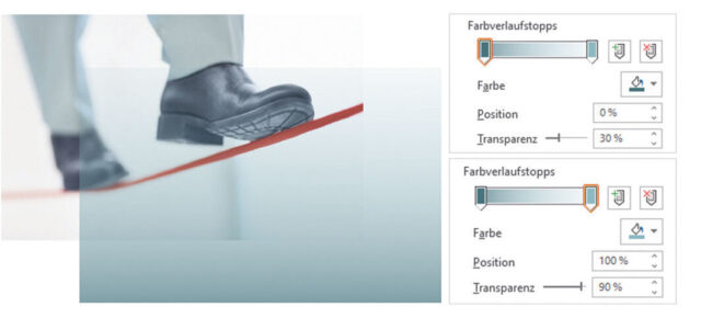 Die Kombination von Bildern und Transparenz auf den Folien ist zurzeit ein Trend. Die Technik begegnet einem in den unterschiedlichsten Medien: TV, Zeitschriften, Web und natürlich auch in PowerPoint. Es wirkt elegant und modern. Der größte Vorteil der Verwendung von Transparenzen ist, dass Bilder sich nicht zu sehr in den Vordergrund drängen und Texte sich somit besser erkennen und lesen lassen. Mit den folgenden drei Varianten lassen sich Bilder, Texte und Transparenzen kombinieren: